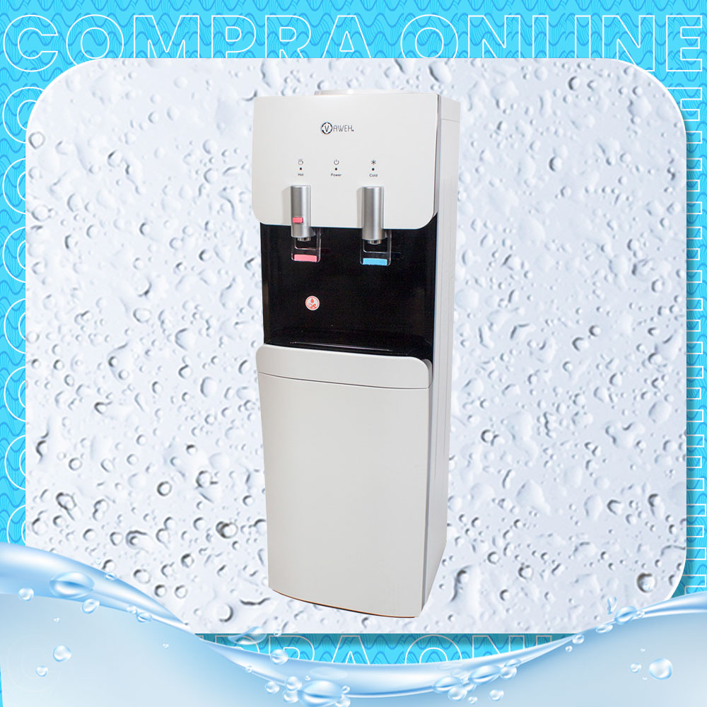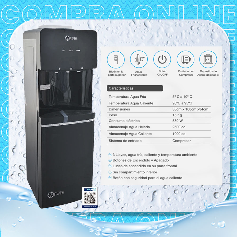 Sistema de dosificación de agua fría y caliente con sistema de enfriado por compresor, posee material de plástico de alta resistencia.
